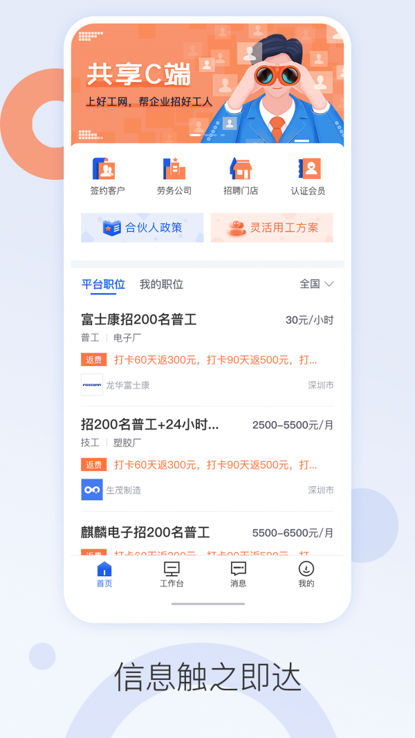 好工网是一个能发布工作招人的软件,在这里全部帮你搞定!一键发布职位(发单)、上传员工工资单、查看员工考勤、员工借支线上打款、人职信息精准匹配、查看/上传员工黑名单、智能管理门店与招聘专员、职位便捷分享。还有共享b端、溯源管理、共享c端、诚信体系、裂变机制、终身归属等强大工具和功能。